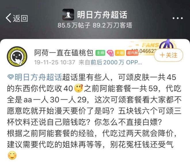 按照慣例,代吃的價(jià)格往往都是雙方AA套餐費(fèi)用,購(gòu)買(mǎi)代吃的人會(huì)再多掏點(diǎn)零頭。但在這次泡泡瑪特聯(lián)名中,代吃們墨守成規(guī)的定價(jià)方式卻發(fā)生了變化,因?yàn)樵燃兇鉃榱顺渣c(diǎn)便宜飯的大學(xué)生群體中,加入了黃牛黨。