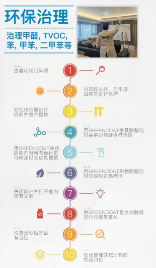 百安居通過(guò)查看現(xiàn)場(chǎng)污染源、對(duì)現(xiàn)場(chǎng)電器、顯示屏、煙感等進(jìn)行保護(hù),做好前期治理準(zhǔn)備;并使用GREENCOAT裝修除味劑對(duì)所有板材進(jìn)行噴涂以及皮具擦拭、用GREENCOAT織物除醛劑對(duì)軟織物進(jìn)場(chǎng)噴涂、關(guān)閉窗戶并打開室內(nèi)所有光源、用GREENCOAT復(fù)合光觸媒進(jìn)行整屋霧化;清理工作完成后,百安居還將最終檢查治理后是否有流掛現(xiàn)場(chǎng),并整理現(xiàn)場(chǎng)、將所有物品歸位,實(shí)現(xiàn)環(huán)保治理全流程閉環(huán)。百安居環(huán)保治理細(xì)心謹(jǐn)慎,規(guī)范安心,助力居住者安心凈享健康居家生活。