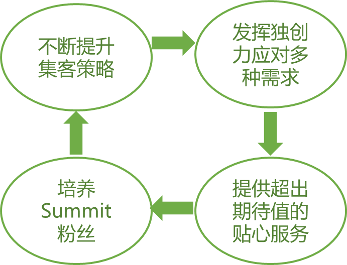 目前,Summit確立了四大策略,①不斷提升集客力、②發(fā)揮獨(dú)創(chuàng)力應(yīng)對(duì)多種需求、③提供超出期待值的貼心服務(wù)、④培養(yǎng)Summit粉絲。并且,Summit將提升集客力、提高來(lái)客數(shù)作為一切策略的前提和目標(biāo),所有商品策略、賣場(chǎng)策略、營(yíng)銷策略都圍繞提高來(lái)客數(shù)推進(jìn)。