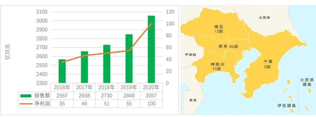 Summit的總部位于東京,截至2021年底在首都圈(一都三縣)開出了118家門店,其中東京都86家、琦玉縣12家、神奈川縣15家、千葉縣5家。2020年度銷售額達(dá)3057億日元(約人民幣合173億元),同比增長(zhǎng)7.3%,凈利潤(rùn)100億日元(約合人民幣5.5億元),單店平均銷售額25.9億日元(約合人民幣1.5億元)。