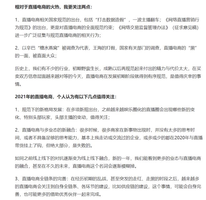 我在2021年初,大概也是這個(gè)時(shí)間段寫(xiě)的一篇文章里提到過(guò)“直播電商的紅與黑”,是基于當(dāng)時(shí)的兩大事件:辛巴的“糖水燕窩”以及《網(wǎng)絡(luò)直播營(yíng)銷行為規(guī)范》《網(wǎng)絡(luò)交易監(jiān)督管理辦法》等系列相關(guān)政策的出臺(tái),提出了“電商行業(yè)的紅與黑”,并提到了2020年個(gè)人對(duì)于直播電商的兩大關(guān)注點(diǎn),2021年值得大家關(guān)注的三個(gè)點(diǎn),如圖: