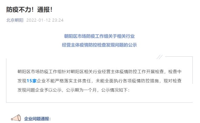 通報(bào)顯示,朝陽區(qū)市場(chǎng)防疫工作組針對(duì)朝陽區(qū)相關(guān)行業(yè)經(jīng)營(yíng)主體疫情防控工作開展檢查,檢查中發(fā)現(xiàn)15家企業(yè)不能嚴(yán)格落實(shí)主體責(zé)任,未能全面執(zhí)行各項(xiàng)疫情防控措施,現(xiàn)對(duì)檢查發(fā)現(xiàn)問題企業(yè)予以公示,公示期為一個(gè)月。