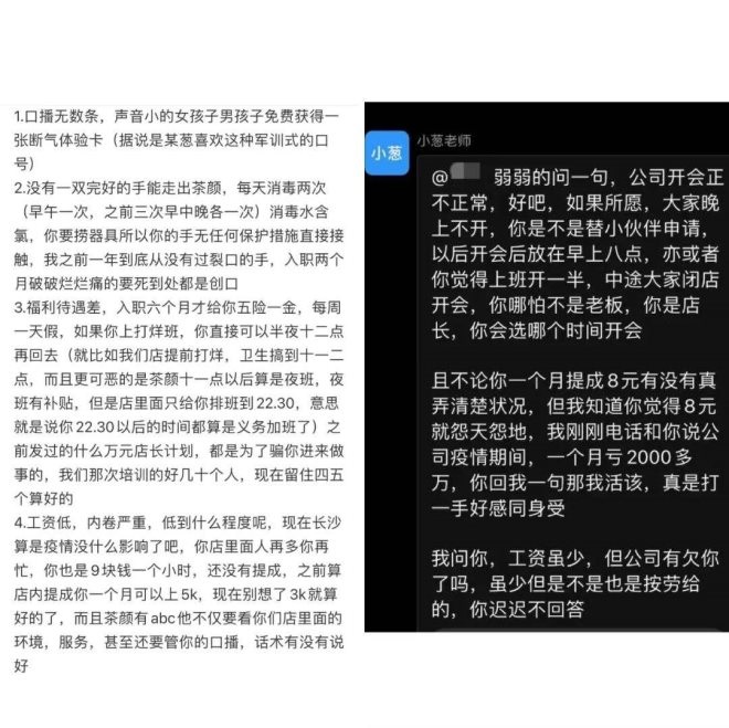 該員工強調(diào),基于這樣的背景,使得茶顏悅色內(nèi)部管理混亂、流程冗雜、內(nèi)斗嚴重!皟(nèi)部小團體情況嚴重,直接導致本分做事的反而不如會拉幫結(jié)派的。”