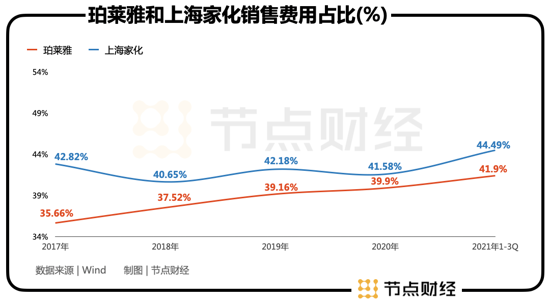 財(cái)報(bào)顯示,2017年-2020年,珀萊雅銷售費(fèi)用占總營收比重為35.66%、37.52%、39.16%、39.9%,上海家化為42.82%、40.65%、42.18%、41.58%。