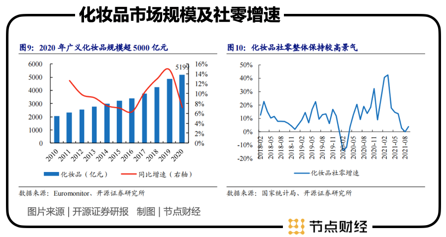 歐睿數(shù)據(jù)顯示,2015-2020年,我國化妝品行業(yè)年復(fù)合增速10.3%,2020年市場規(guī)模已超過5000億元。