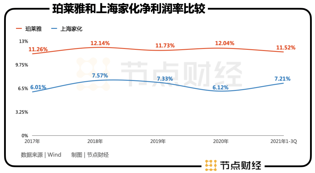2017年-2020年,上海家化營收和歸母凈利潤年復(fù)合增速分別為2.7%、3.3%,遠(yuǎn)低于珀萊雅。