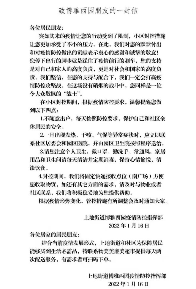 海淀區(qū)第一時間落人、落位、落管控,于15日上午10時對病例居住小區(qū)、工作單位樓宇進行了封閉管理。對博雅西園小區(qū)啟動臨時封控,實行“區(qū)域封閉、足不出戶、服務上門”的管理措施。