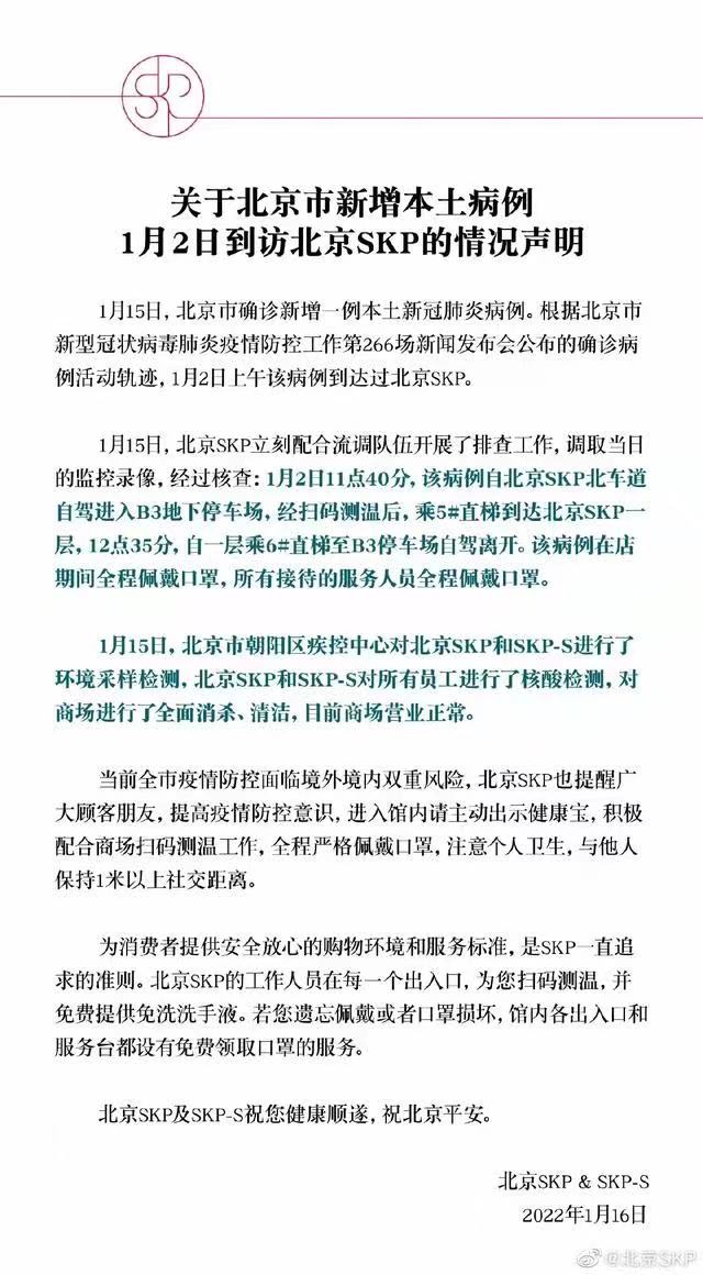 北京SKP商場(chǎng):已全面消殺,目前營(yíng)業(yè)正常