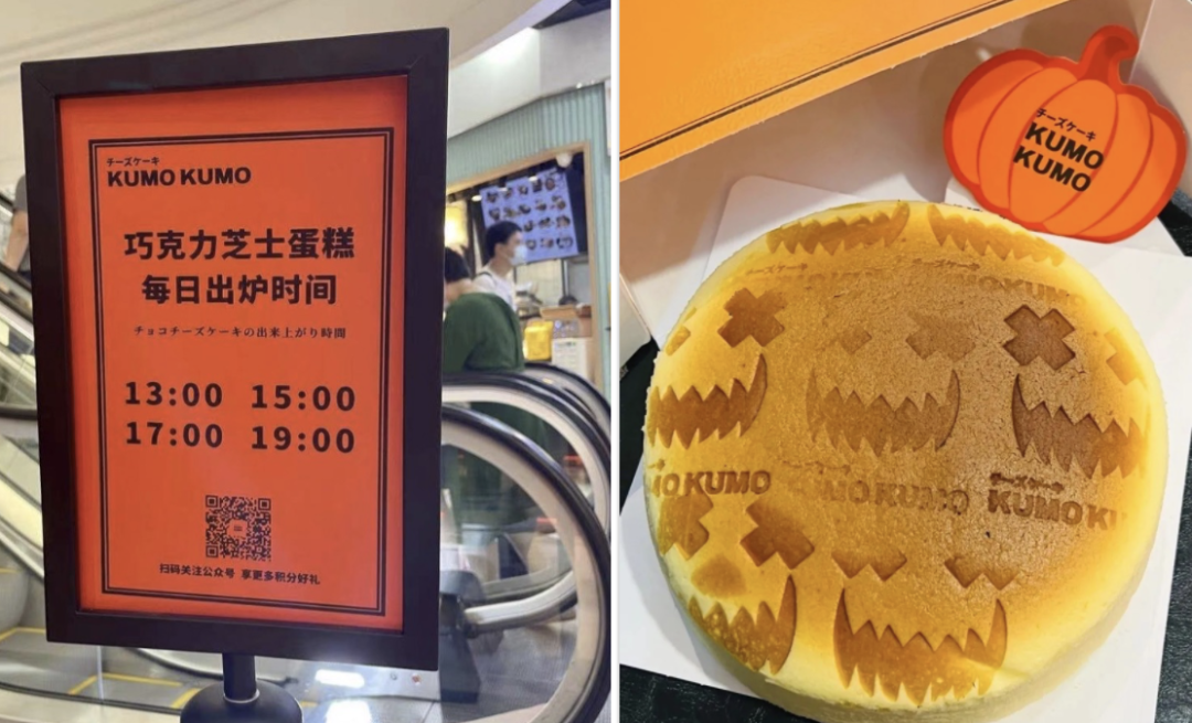 例如玩饑餓營銷,玩限量。芝士蛋糕限購一個;除了芝士蛋糕外,巧克力、咸蛋黃流心等口味,還有限定的出爐時間,只有定時蹲點才能買到;趕上萬圣節(jié),還有限定版口味和限定印花,把饑餓營銷這一招用得是爐火純青。