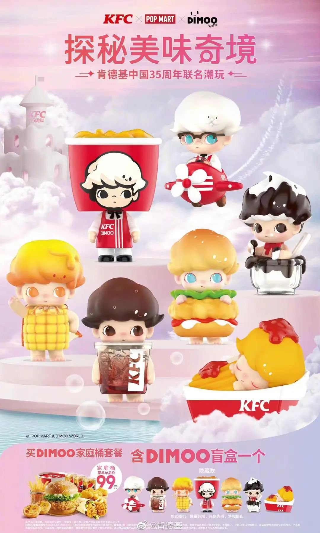 消費(fèi)者還沒(méi)從麥當(dāng)勞貓窩緩過(guò)神來(lái),肯德基又在1月4日推出了和泡泡瑪特聯(lián)名的35周年Dimoo盲盒。據(jù)官方發(fā)布的活動(dòng)介紹,價(jià)值99元的Dimoo家庭桶套餐中含一個(gè)Dimoo盲盒,該盲盒共有7款,包括一個(gè)隱藏款。