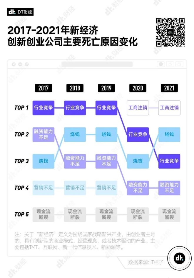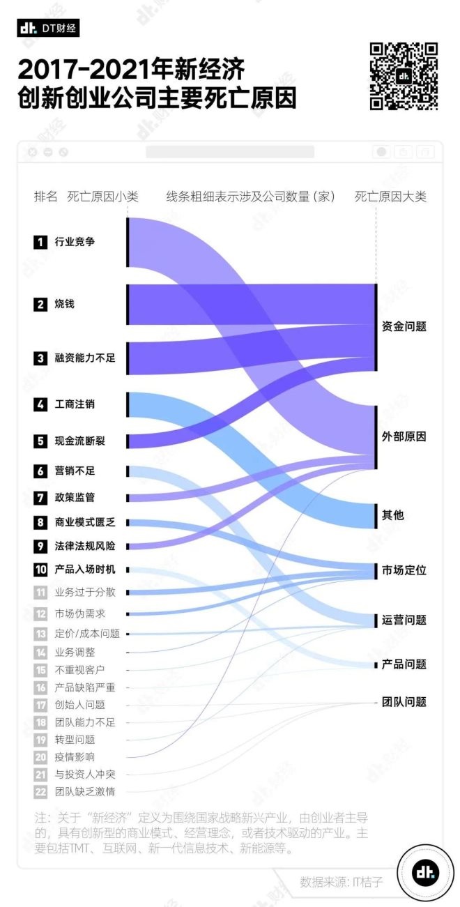 我們還查看了近五年創(chuàng)業(yè)公司的死亡原因,發(fā)現(xiàn)行業(yè)競(jìng)爭(zhēng)、燒錢和融資能力不足最為普遍。