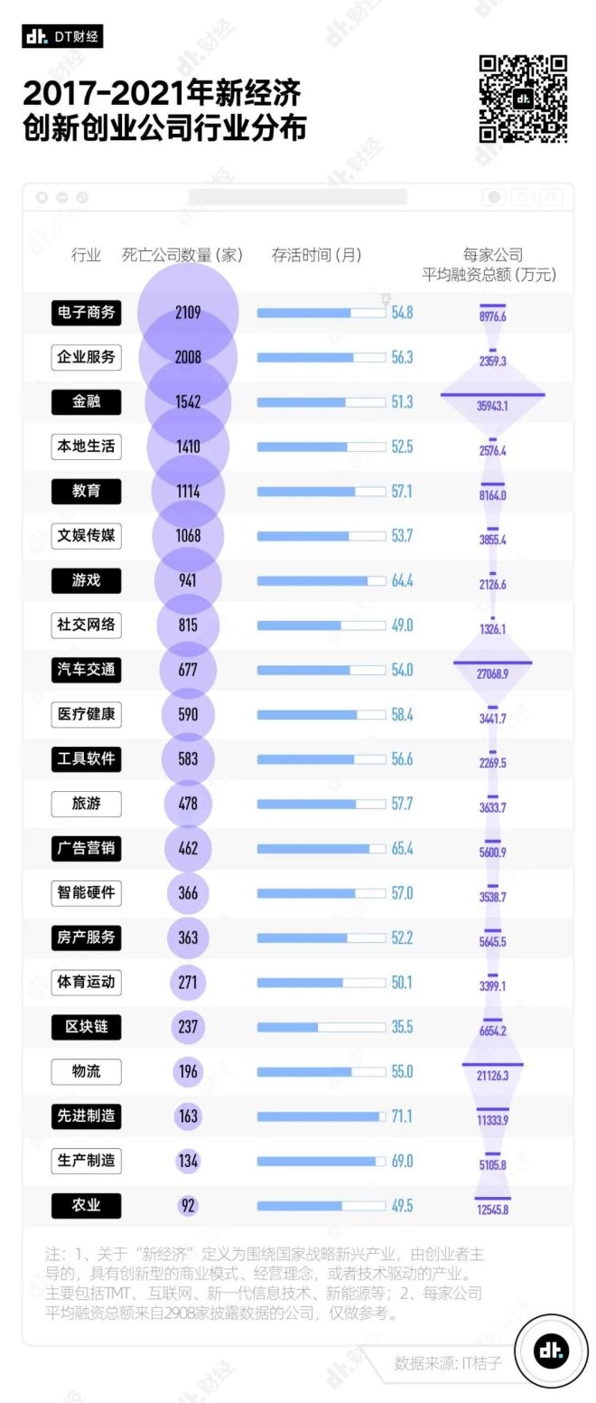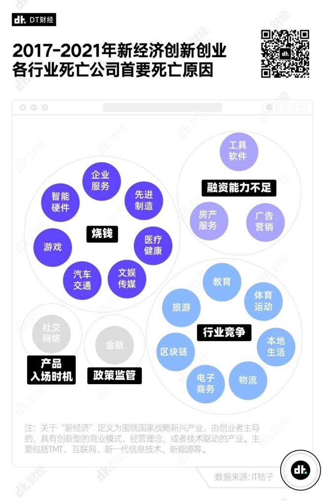 企業(yè)服務(wù)、先進(jìn)制造、游戲、文娛傳媒等,在真正擁有營(yíng)收前,需要在基礎(chǔ)設(shè)施、版權(quán)作品等方面大量投入,于是最大死因是燒錢;本地生活、電子商務(wù)等行業(yè),風(fēng)頭盛、玩家多,創(chuàng)業(yè)公司主要死于行業(yè)競(jìng)爭(zhēng);工具軟件、廣告營(yíng)銷和房產(chǎn)業(yè)務(wù),如今故事很難性感,主要死于融資能力不足。