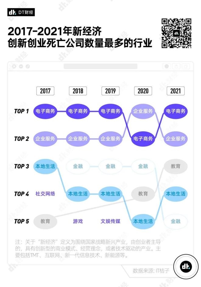 從時(shí)間維度來(lái)看,前些年還有社交網(wǎng)絡(luò)、游戲、文娛傳媒等行業(yè)闖入死亡黑洞前列,近兩年的死亡熱點(diǎn)已經(jīng)非常穩(wěn)定,電子商務(wù)、企業(yè)服務(wù)、教育、本地生活和金融牢牢占住TOP 5的位子。