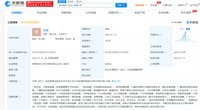 天眼查App顯示,1月14日,由阿里巴巴(中國(guó))軟件有限公司全資持股的尋鄉(xiāng)網(wǎng)絡(luò)(杭州)有限公司成立,注冊(cè)資本100萬,法定代表人林健,經(jīng)營(yíng)范圍含互聯(lián)網(wǎng)銷售;廣告設(shè)計(jì)、代理;特殊醫(yī)學(xué)用途配方食品銷售;農(nóng)副產(chǎn)品銷售等方面。
