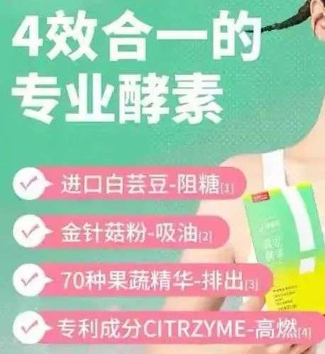 “4效合一:進(jìn)口白蕓豆-阻糖,金針菇粉-吸油,70種果蔬精華-排出,專(zhuān)利成分CITRZYME-高燃。”這是月銷(xiāo)3萬(wàn)的某酵素品牌在宣傳海報(bào)上給出的功效,一串串“專(zhuān)業(yè)術(shù)語(yǔ)”令人眼花繚亂。