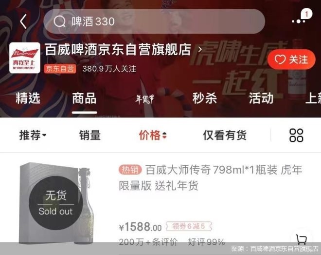 北京商報記者登錄天貓平臺與京東平臺了解到,截至1月17日,兩款產(chǎn)品均已上架近10天,但月銷均在50筆以下,而百威啤酒精釀大師傳奇虎年限量版產(chǎn)品已經(jīng)無法在天貓平臺找到,在京東平臺也顯示無貨的狀態(tài)。天貓平臺客服對北京商報記者表示,該款產(chǎn)品已經(jīng)下架。