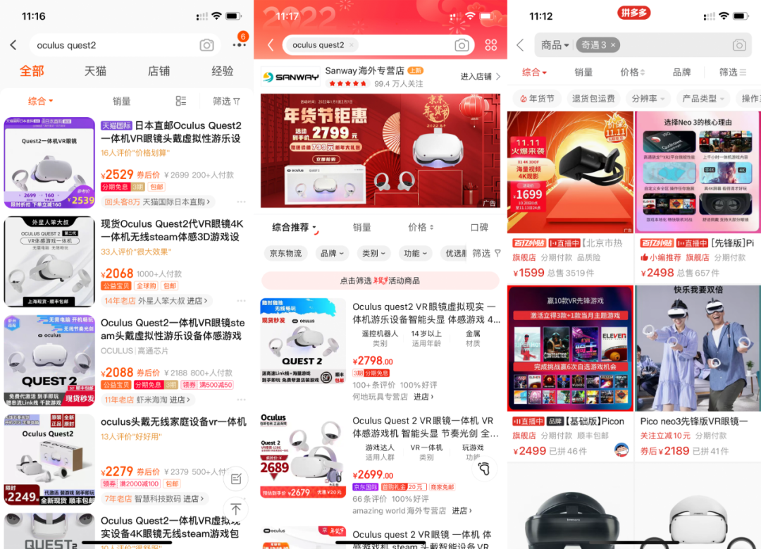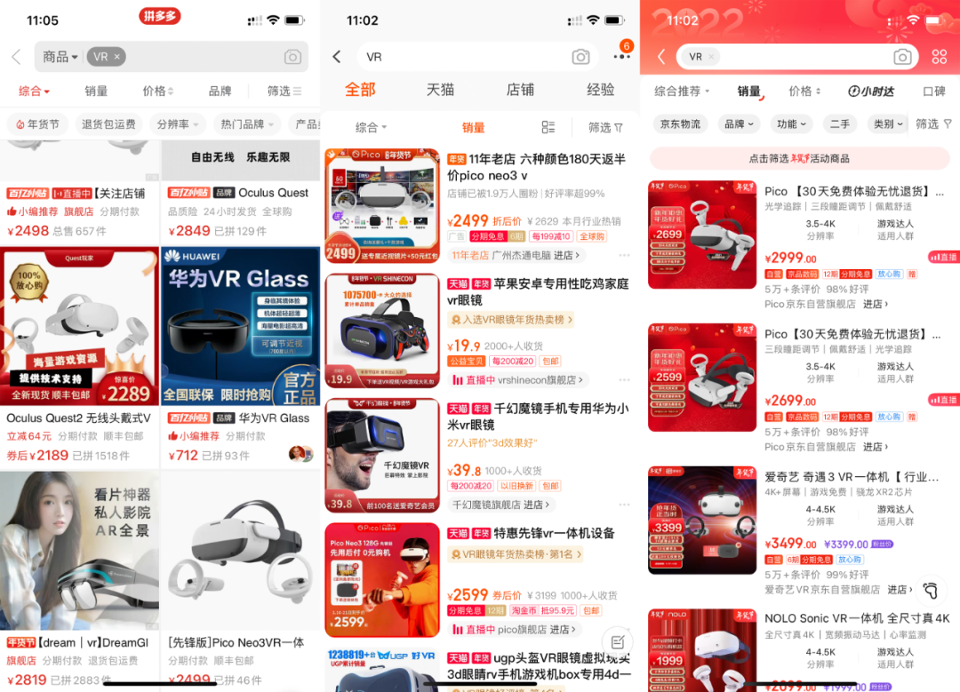 拼多多、淘寶、京東平臺(tái)VR搜索結(jié)果