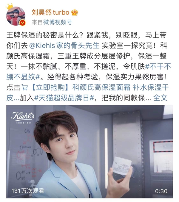 此外,科顏氏品牌代言人劉昊然還帶領(lǐng)大家走進@Kiehls家的骨頭先生實驗室,探究科顏氏高保濕霜的保濕秘密,引來超百萬人次在線圍觀。