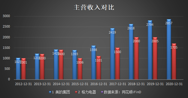 反映到經(jīng)營業(yè)績上,雙方差距也非常明顯。2020年,盡管受到新冠疫情沖擊,美的集團(tuán)憑借多品類發(fā)展優(yōu)勢主營收入仍保持了正增長,格力電器主營收入則出現(xiàn)了15%的同比下滑。
