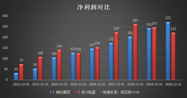 當(dāng)年年報數(shù)據(jù)顯示,美的集團(tuán)實現(xiàn)營業(yè)收入2857億元,凈利潤272億元;同期,格力電器實現(xiàn)主營收入1705億元,凈利潤222億元。對比看,美的集團(tuán)營收超出格力1152億元,凈利潤則超過后者50億元,這也是近五年來美的在凈利潤方面首次超越格力。