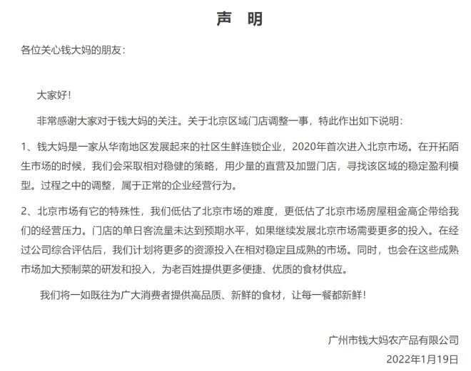 1月19日,錢大媽在微信公眾號上發(fā)布聲明表示,在開拓陌生市場的時(shí)候,會采取相對穩(wěn)健的策略,用少量的直營及加盟門店,尋找該區(qū)域的穩(wěn)定盈利模型。過程之中的調(diào)整,屬于正常的企業(yè)經(jīng)營行為。