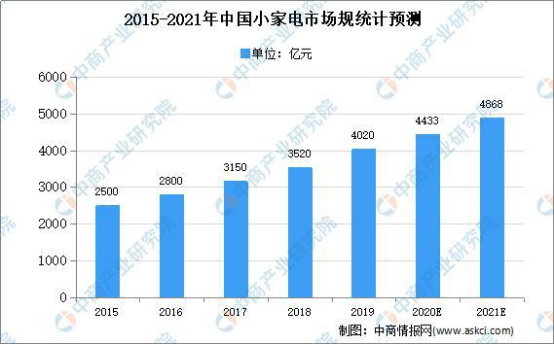 數(shù)據(jù)顯示,2019年我國小家電市場規(guī)模達(dá)4020億元,中商產(chǎn)業(yè)研究院預(yù)測,2021年我國小家電市場規(guī)模將達(dá)4868億元。