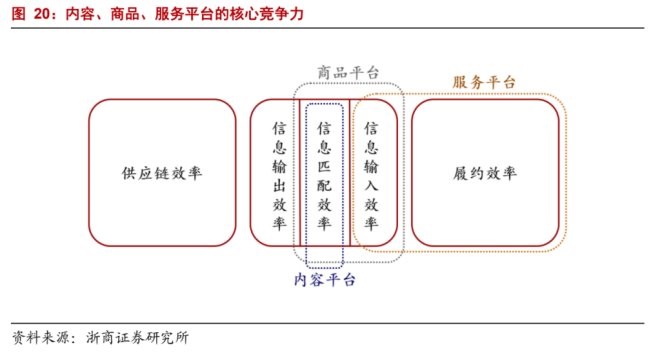 平臺效率基本可拆分為供應鏈效率、信息效率和履約效率。供應鏈效率,指的是商品或服務被生產(chǎn)出來的效率,主要指標是生產(chǎn)成本;而信息效率,指的是這里指商品或服務和消費者之間匹配的效率,主要指標是匹配準確度;履約效率,則是將商品或服務交付給消費者的效率,主要指標是履約成本。