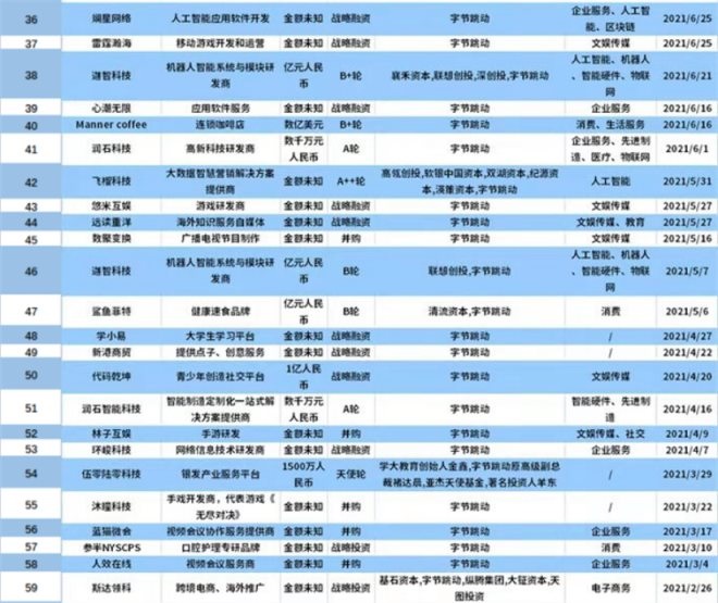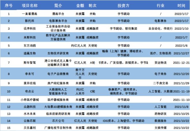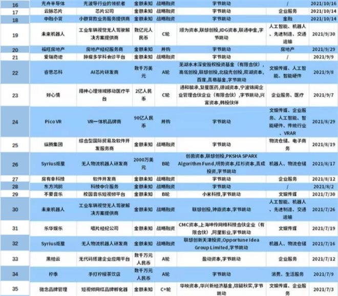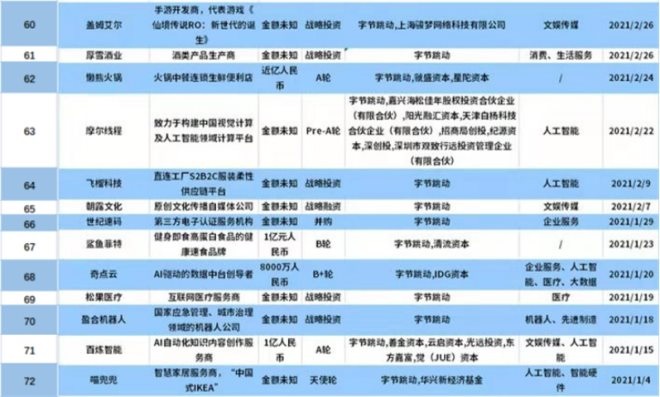字節(jié)跳動2021年在各領域的投資數(shù)量