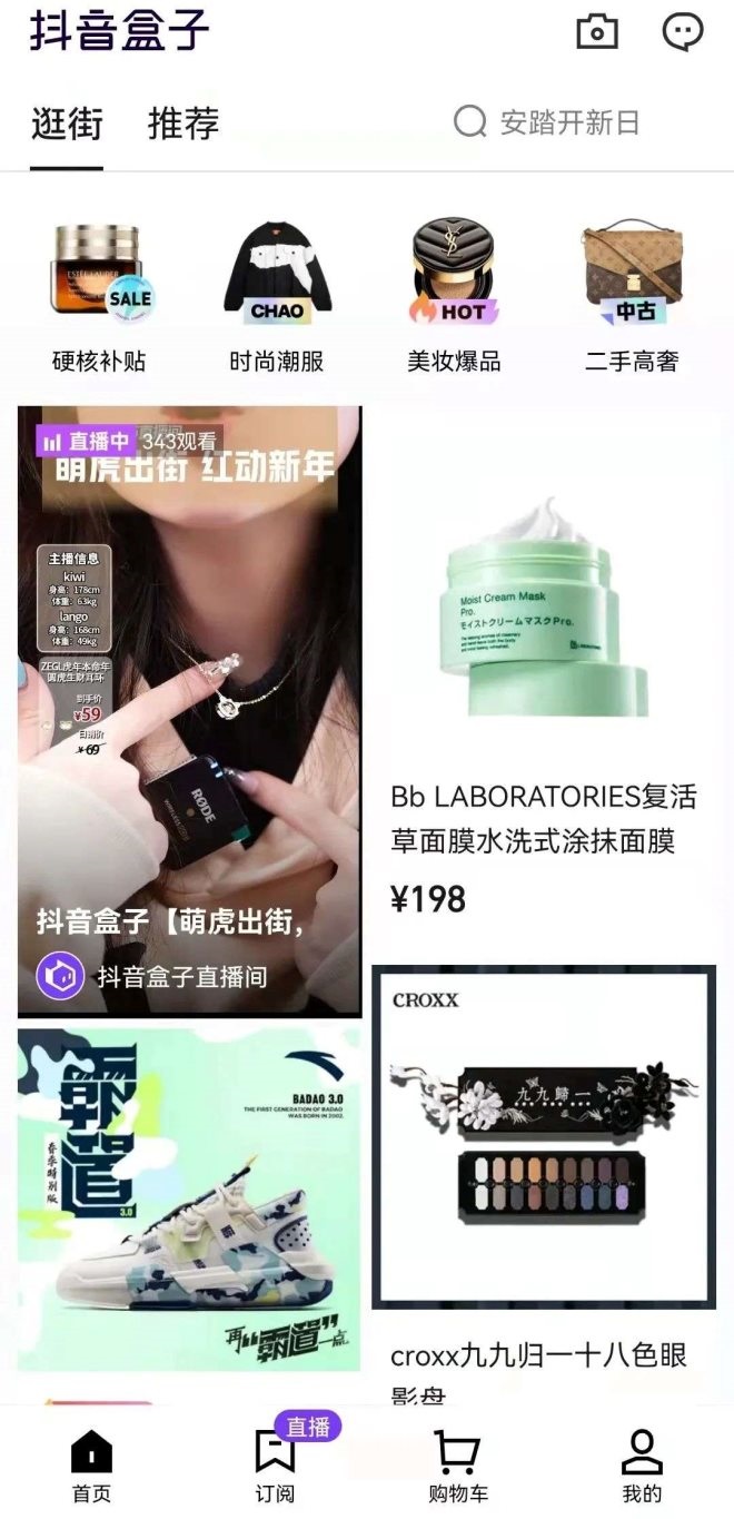 抖音盒子首頁分為“逛街”和“推薦”兩個(gè)界面,其中“逛街”設(shè)置四個(gè)不同品類的入口,包括硬核補(bǔ)貼、時(shí)尚潮服、美妝爆品和二手高奢。往下滑是直播間和雙列產(chǎn)品展示,數(shù)據(jù)與抖音APP同步。相比抖音目前接入淘寶外鏈,抖音盒子更聚焦在抖品牌和抖店的運(yùn)營。