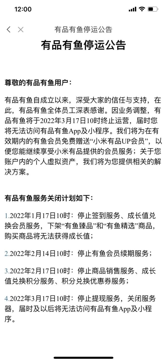 公告顯示,停運(yùn)后,消費(fèi)者將無(wú)法訪問(wèn)有品有魚App及小程序。同時(shí),自1月17日至3月17日,有品有魚將分4個(gè)階段關(guān)閉服務(wù)。