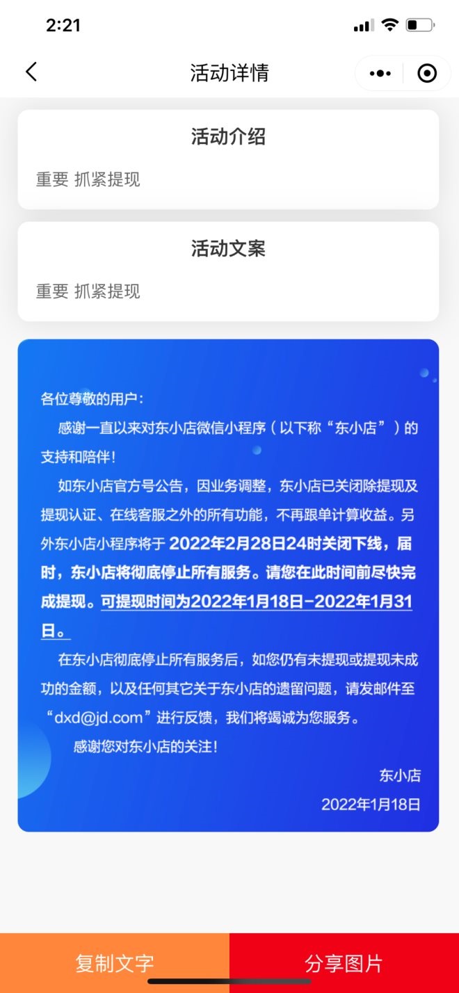 1月18日,“東小店”發(fā)布聲明稱:因業(yè)務(wù)調(diào)整,東小店已關(guān)閉除提現(xiàn)及提現(xiàn)認(rèn)證、在線客服之外的所有功能,不再跟單計(jì)算收益。另外東小店小程序?qū)⒂?022年2月28日24時(shí)關(guān)閉下線,屆時(shí),東小店將徹底停止所有服務(wù)。東小店提醒用戶盡快完成提現(xiàn),可提現(xiàn)時(shí)間為2022年1月18日-2022年1月31日。其中,讓用戶“抓緊提現(xiàn)”的重要提示尤其醒目。
