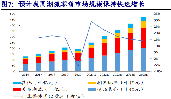 另據(jù)弗若斯特沙利文數(shù)據(jù),按GMV計算,中國潮流零售行業(yè)的市場規(guī)模從2016年的1298億元增長至2020年的1952億元,年復合增長率為10.7%,預計到2025年市場規(guī)模將達4750億元。