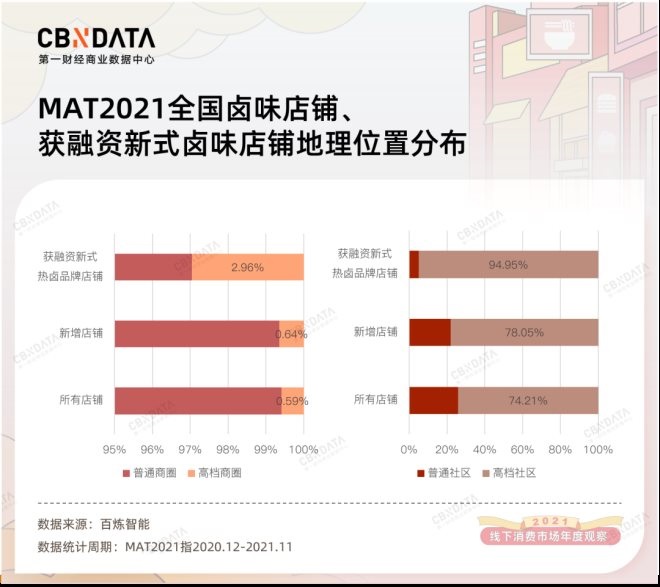 鹵味門(mén)店選址“升級(jí)”的現(xiàn)象,主要由新式熱鹵品牌驅(qū)動(dòng)。據(jù)CBNData統(tǒng)計(jì),2021年獲得融資的新式鹵味品牌,超六成店鋪都分布在一線、新一線城市,比鹵味行業(yè)整體高出約35個(gè)百分點(diǎn);分布于高檔商圈、高檔社區(qū)的店鋪比例,比鹵味行業(yè)整體分別高出4倍、20個(gè)百分點(diǎn)。