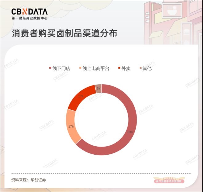 隨著鎖鮮裝、冷鏈技術(shù)的普及,以及越來(lái)越多互聯(lián)網(wǎng)鹵味零食品牌的出現(xiàn),線上鹵味消費(fèi)規(guī)模近年來(lái)不斷增加。但線下依舊是鹵味消費(fèi)的最主要渠道,占據(jù)超6成的市場(chǎng)份額。