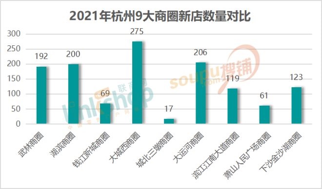 5、從商圈角度看,以城西銀泰城、西溪印象城、龍湖杭州西溪天街為首的大城西商圈過去一年開出了275家新店,一舉斬獲商圈新店冠軍。杭州大悅城、遠(yuǎn)洋樂堤港打頭陣的大運(yùn)河商圈以206家新店獲得亞軍。湖濱銀泰in77以200家新店的數(shù)量,憑一己之力助力湖濱商圈沖上季軍寶座。而由杭州大廈、武林銀泰、國大城市廣場、嘉里中心四大商場坐鎮(zhèn)的武林商圈2021年新開品牌雖未達(dá)到200家,但也以190家品牌的更新規(guī)模,鞏固商圈氣勢。