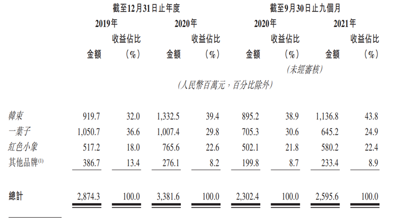 根據(jù)招股書數(shù)據(jù)顯示,2021年前三季度,韓束品牌期內(nèi)的占比達到43.8%,對應(yīng)的收入為11.37億元。同期,一葉子、紅色小象和其他品牌的收入分別為6.45億元、5.80億元和2.33億元,占比分別為24.9%、22.4%和8.9%。