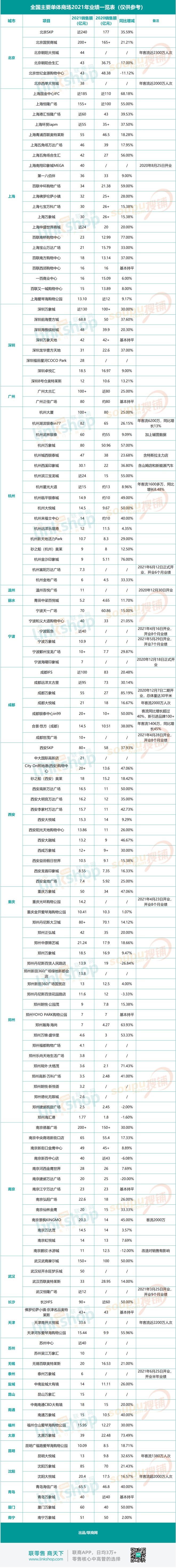 附:2021全國主要單體商場業(yè)績統(tǒng)計表
