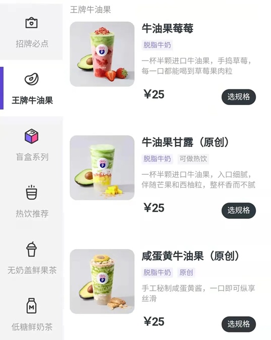 目前,PINTEA推出22個SKU,包含王牌牛油果、無奶蓋鮮果茶、低糖鮮奶茶、清爽檸檬等系列,定價在22~25元之間。長期主推產(chǎn)品為“王牌牛油果系列”。
