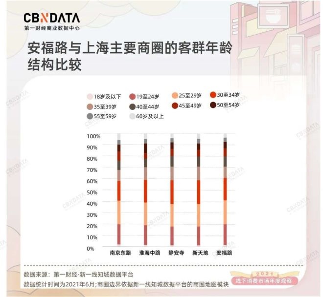 其三,年輕人在哪,品牌就去哪。網(wǎng)紅街區(qū)之所以吸引品牌的入駐,龐大的客流量和更年輕的消費(fèi)群體是不容忽視的原因。2021年黃金周,上海武康路就因?yàn)榉鋼矶恋娜珖?guó)打卡游客而上了熱搜。根據(jù)徐匯區(qū)政府的統(tǒng)計(jì)數(shù)據(jù),國(guó)慶期間安福路每天的客流量超過(guò)了兩萬(wàn)人。而新一線數(shù)據(jù)顯示,淮海中路、安福路、新天地等幾大網(wǎng)紅街區(qū),六成左右的客群年齡在34歲以下,29歲以下客群占了四成。