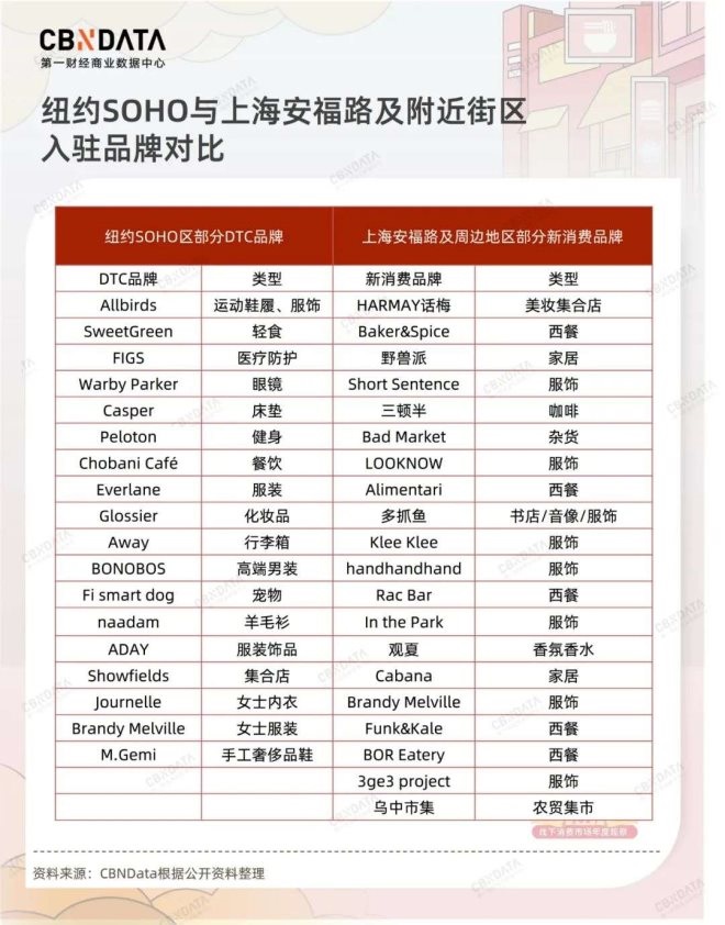 對(duì)比入駐SOHO的DTC品牌大多已上市或即將上市,上海安福路街區(qū)的新消費(fèi)品牌多數(shù)仍在融資階段。從涉及品類上看,SOHO的品牌涵蓋的品類更豐富也更細(xì)分,包括寵物、床墊、眼鏡、奢侈品服飾、醫(yī)療人員功能設(shè)備等等,而安福路街區(qū)的品牌仍以衣食為主。換句話說(shuō),SOHO的商業(yè)形態(tài)更多樣,這樣的多樣性不僅滿足了當(dāng)?shù)鼐用竦纳钚枰,給了SOHO更長(zhǎng)久的生命力,也實(shí)現(xiàn)了流量互補(bǔ),幫助不同的消費(fèi)品牌吸引新客。而由于SOHO藝術(shù)街區(qū)的底色,入駐其中的所有商業(yè)門店都要比其他街區(qū)更加講究品位、格調(diào)以及商品的原創(chuàng)性——這些都是國(guó)內(nèi)網(wǎng)紅街區(qū)暫時(shí)所不具有的。