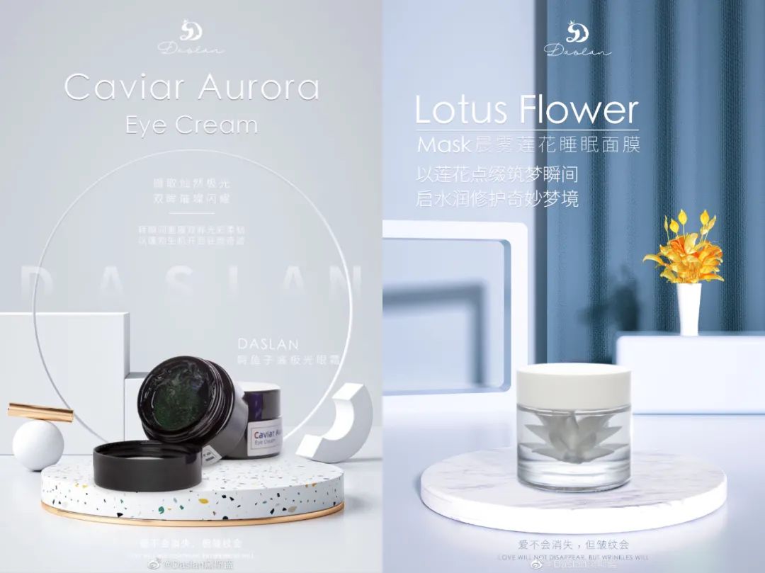 「Daslan」隸屬沈陽黛斯藍(lán)伊莎生物科技有限公司,從2014年開始專注于抗衰老功效化妝品產(chǎn)品的研發(fā),于2020年正式投產(chǎn)并推向市場,面向25-35歲用戶群體。目前,其已推出四款產(chǎn)品:黛斯藍(lán)鱘魚子醬面霜、黛斯藍(lán)鱘魚子醬極光眼霜、黛斯藍(lán)魚子極光精華水、黛斯藍(lán)晨霧蓮花睡眠面膜。