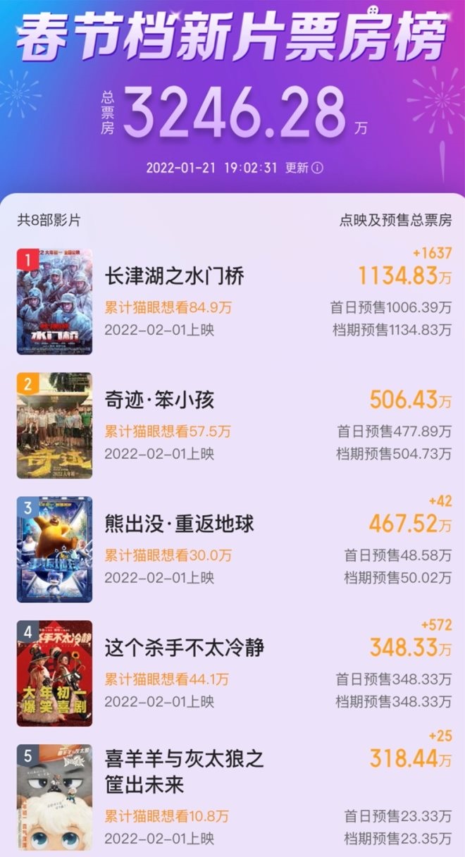 截至發(fā)稿時(shí),春節(jié)檔新片預(yù)售總票房已超過3300萬,其中《長(zhǎng)津湖之水門橋》的票房已超過1000萬。