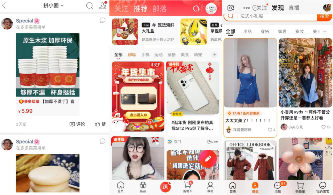 從左至右分別是:拼多多的拼小圈、京東的“逛”、淘寶的“逛逛” 來源 / 拼多多、京東、淘寶APP截圖