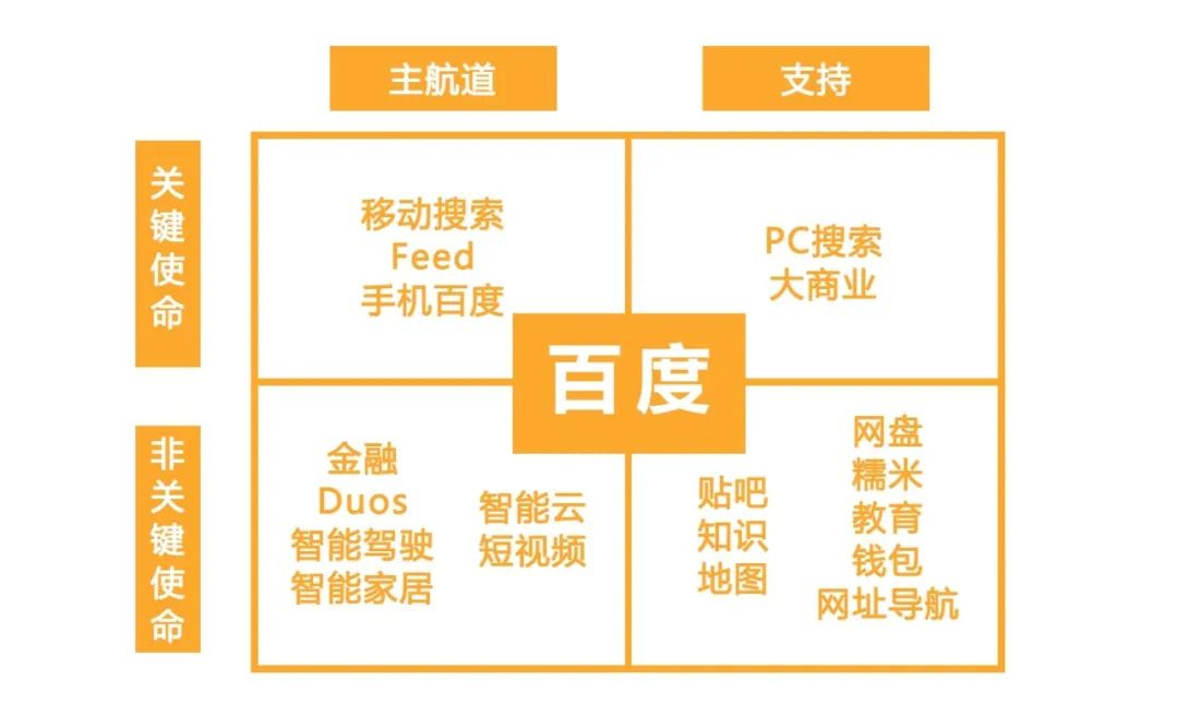 陸奇給百度的未來(lái)定位是:不僅做一家搜索引擎公司,還是一家基于AI的平臺(tái)型公司。所以,在他制定的“四象限”戰(zhàn)略中,把百度貼吧、知識(shí)、地圖、糯米等過(guò)去百度四大業(yè)務(wù)劃分至非主航道中,將探索和孵化中的百度金融、Duos、智能駕駛、智能家居、智能云、短視頻和AIG提上主航道,至于移動(dòng)搜索則作為護(hù)城河為以上業(yè)務(wù)提供現(xiàn)金流支撐。