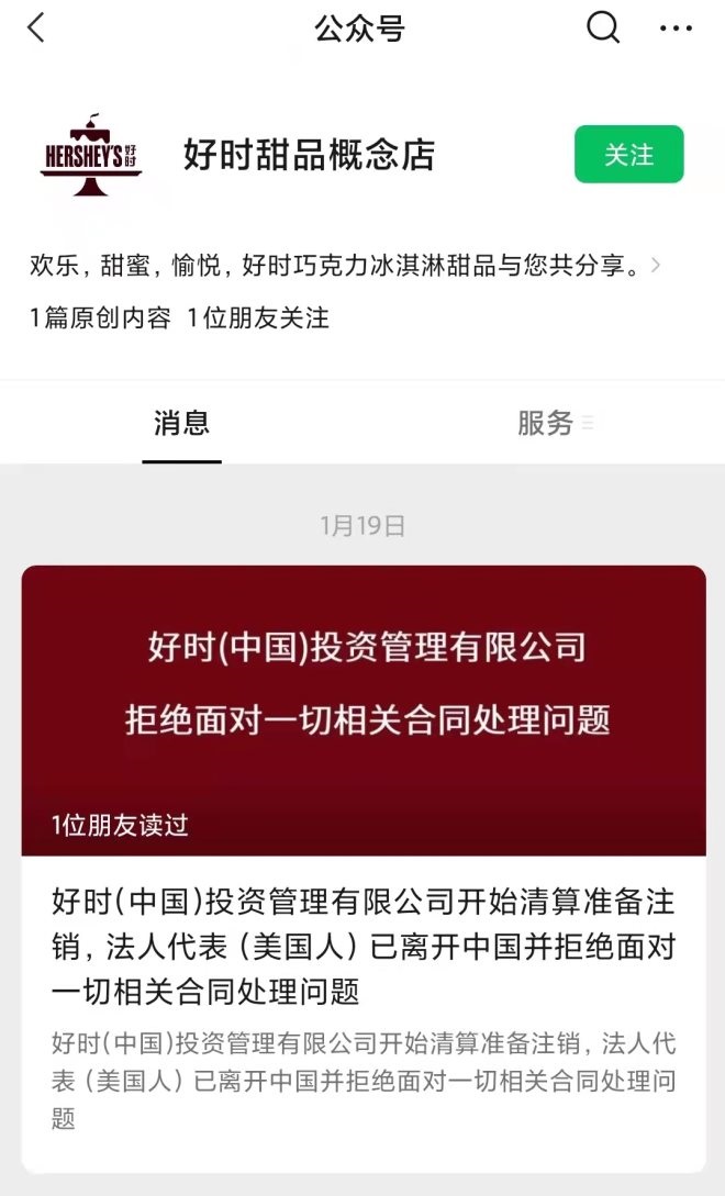 1月19日,名為“好時(shí)甜品概念店”(賬號主體為“深圳聯(lián)合天空餐飲管理有限公司”)的微信訂閱號發(fā)文稱:好時(shí)公司因調(diào)整中國大陸地區(qū)發(fā)展策略,擬縮減公司人數(shù)并調(diào)整中國市場規(guī)模,好時(shí)公司在無理由、無預(yù)警通知下要求解除雙方之合作關(guān)系。