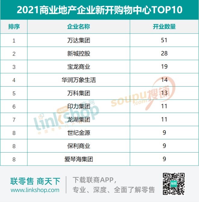 頭部商業(yè)地產(chǎn)企業(yè)2021年新開購物中心數(shù)量TOP10