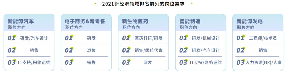 具體到崗位上,從脈脈研究數(shù)據(jù)看(圖5),新經(jīng)濟領域包括新能源汽車和發(fā)電、電商/新零售、新生物醫(yī)藥以及智能制造,研發(fā)和技術(shù)人才需求量均排在首位。