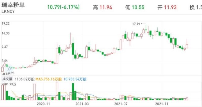 2020年6月29日退到粉單市場,瑞幸咖啡開盤價為0.98美元,之后并沒有一蹶不振,反而呈現(xiàn)震蕩走高的姿態(tài),2021年創(chuàng)下17.79美元的高價,以此計算漲幅高達(dá)17.15倍。