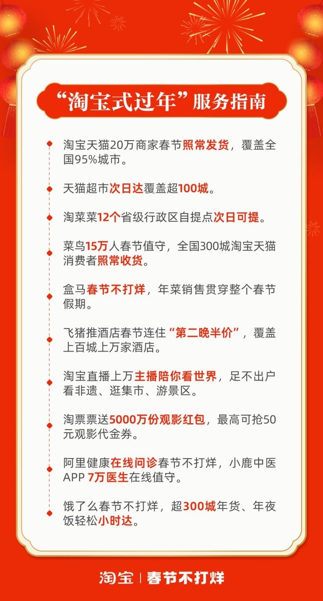 除20萬淘寶天貓商家春節(jié)照常發(fā)貨外,“淘寶式過年”還將為消費(fèi)者提供更多“春節(jié)不打烊”服務(wù)。
