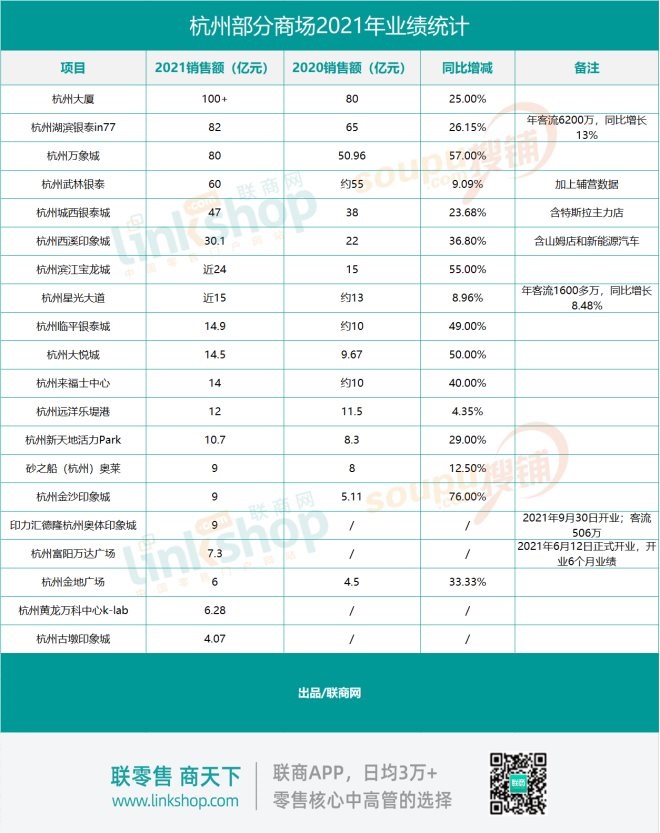 杭州2021年20家商場銷售超500億,首個100億商場誕生
